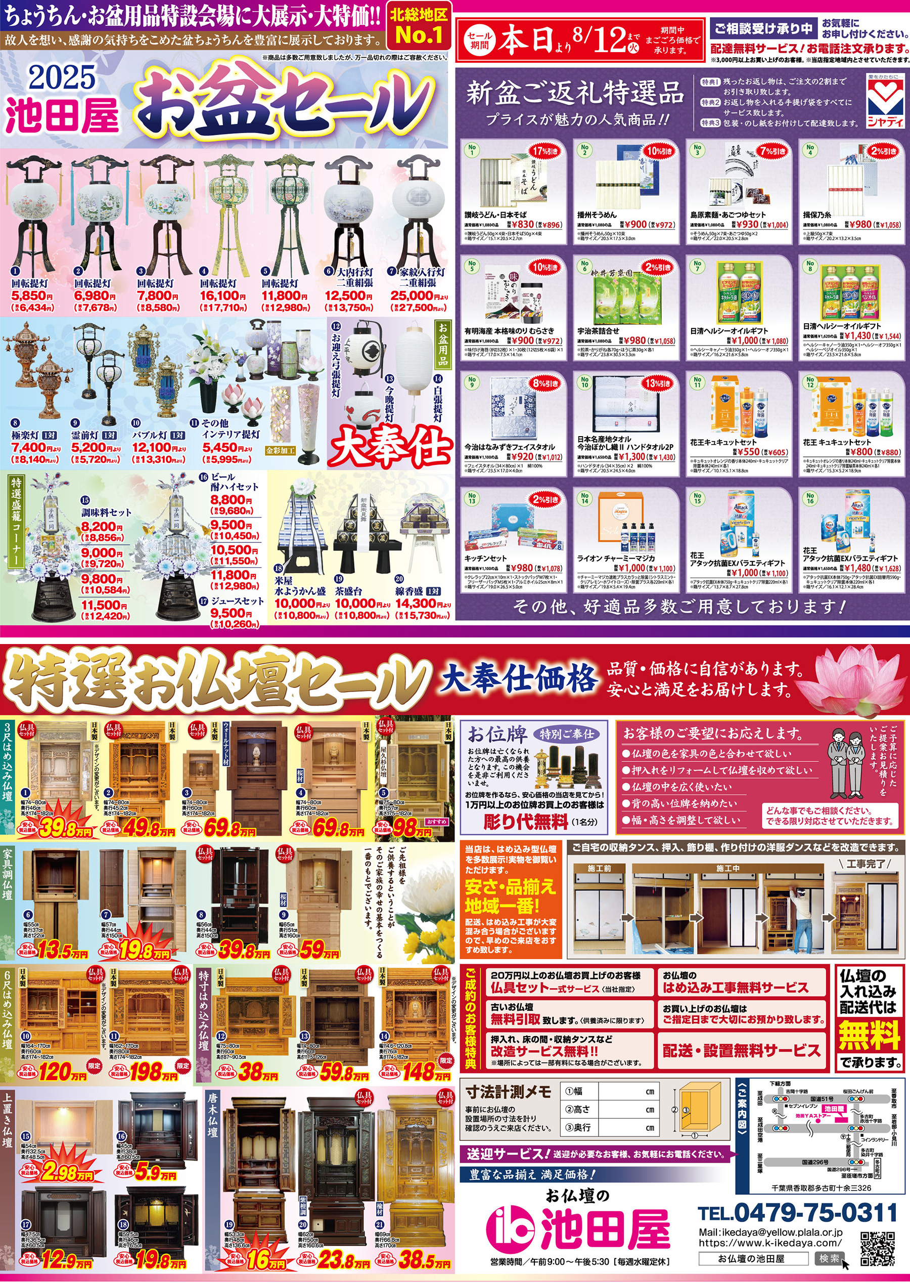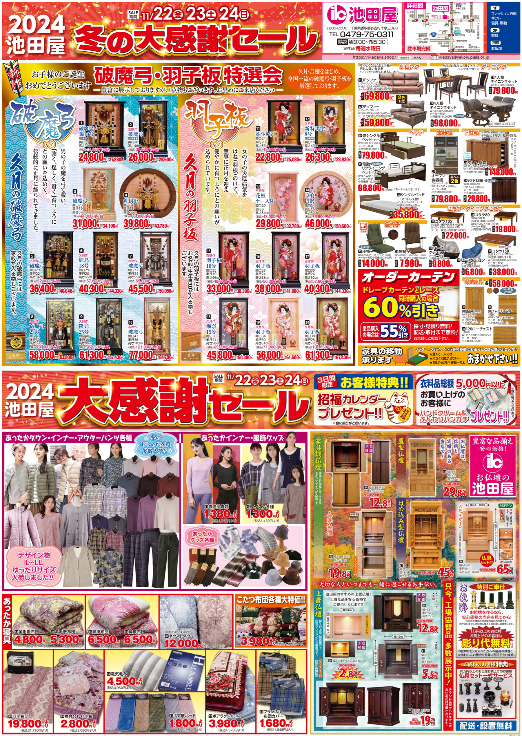 | » 最新のお知らせ 2025年10月17日 【羽子板・破魔弓】 特設会場会場にて、有名メーカー新作多数展示中!! 2025年9月21日 オーダーカーテンキャンペーンを開催しております。 2025年6月12日 際物コーナーで盆提灯・盛籠など多数展示しております。 2025年6月12日 【2025夏版】 池田屋チラシを更新しました。 2022年12月4日 無垢を使った家具のご提案 2022年3月28日 寝具コーナーで【98%の医師が推奨した健康枕】の販売を開始いたしました。 |