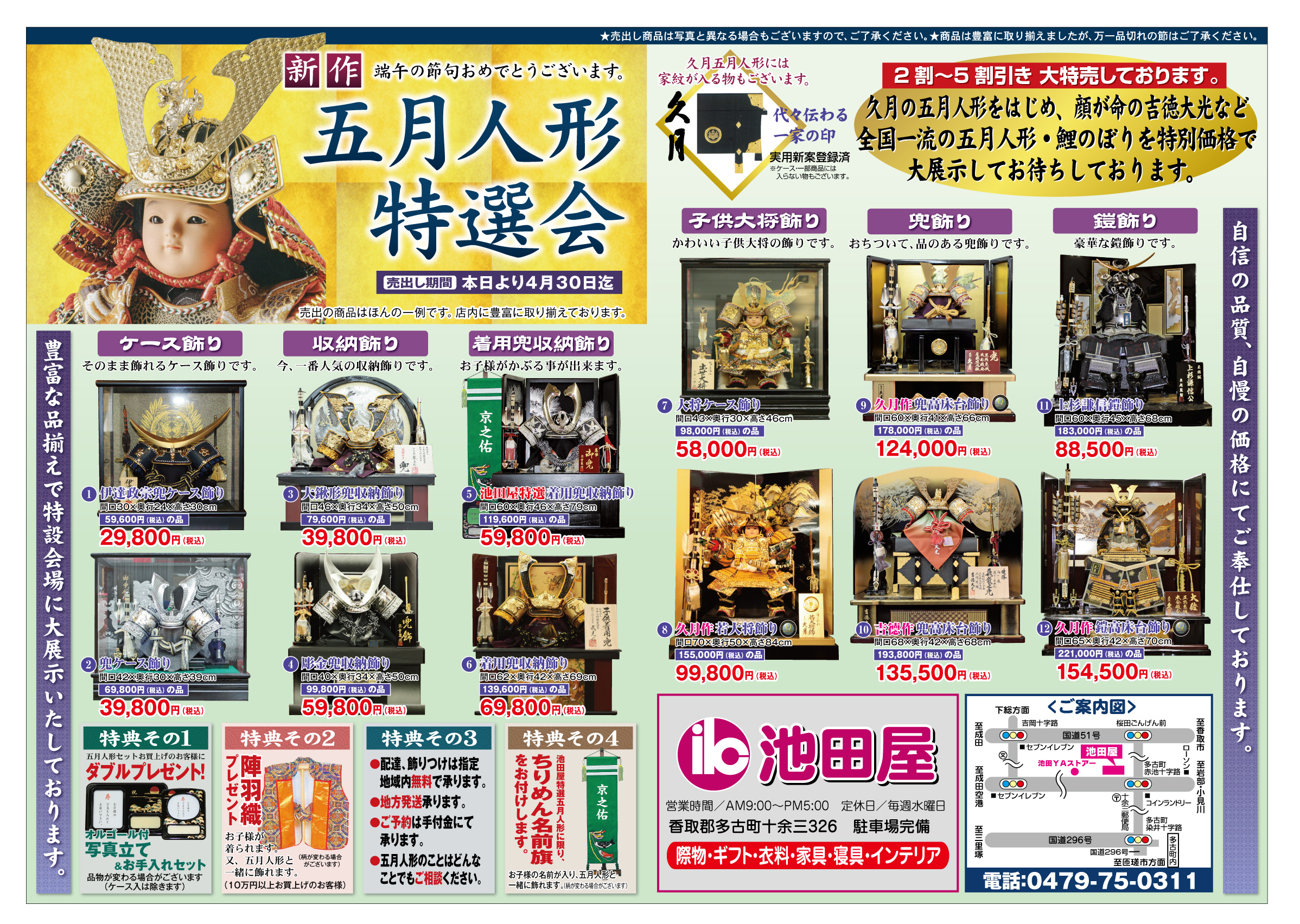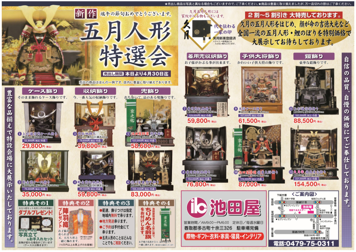 ■電 話0479-75-0311(代表) ■F A X0479-75-1221 ■営業時間9:00〜17:30 ■定 休 日水曜日 ■メ ー ル info@ikedaya.shop